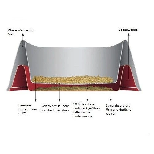- Entfernen Sie täglich den Kot aus der oberen Streuschicht, um die Pellets sauber zu halten.